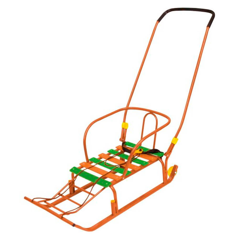 Санки комплектуются колесиками и съемным толкателем. Максимальная нагрузка — 25 кг.