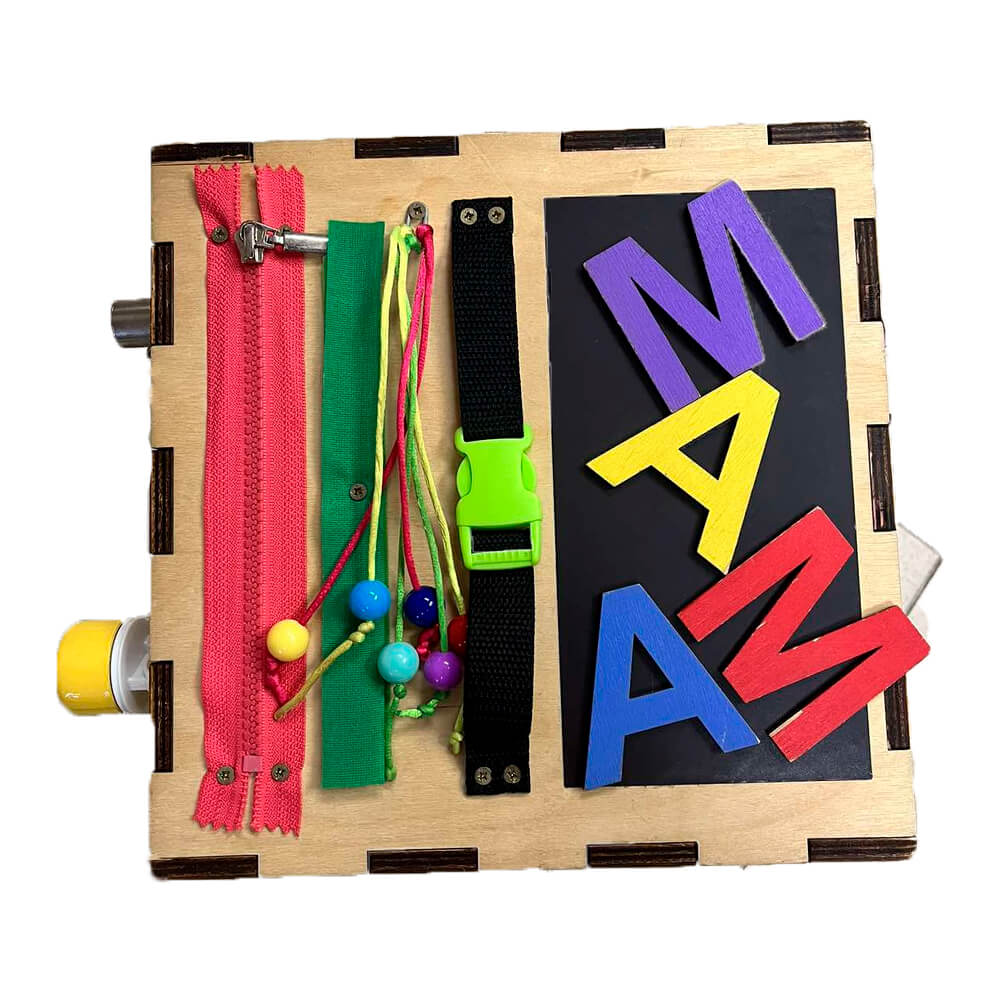 - 5-я грань Магнитная поверхность: деревянные магнитные буквы на составление слов «мама» и «папа» в комплекте, изучение цвета, слов, развитие логического мышления: молния, контактная лента (липучка), бусинки на веревках