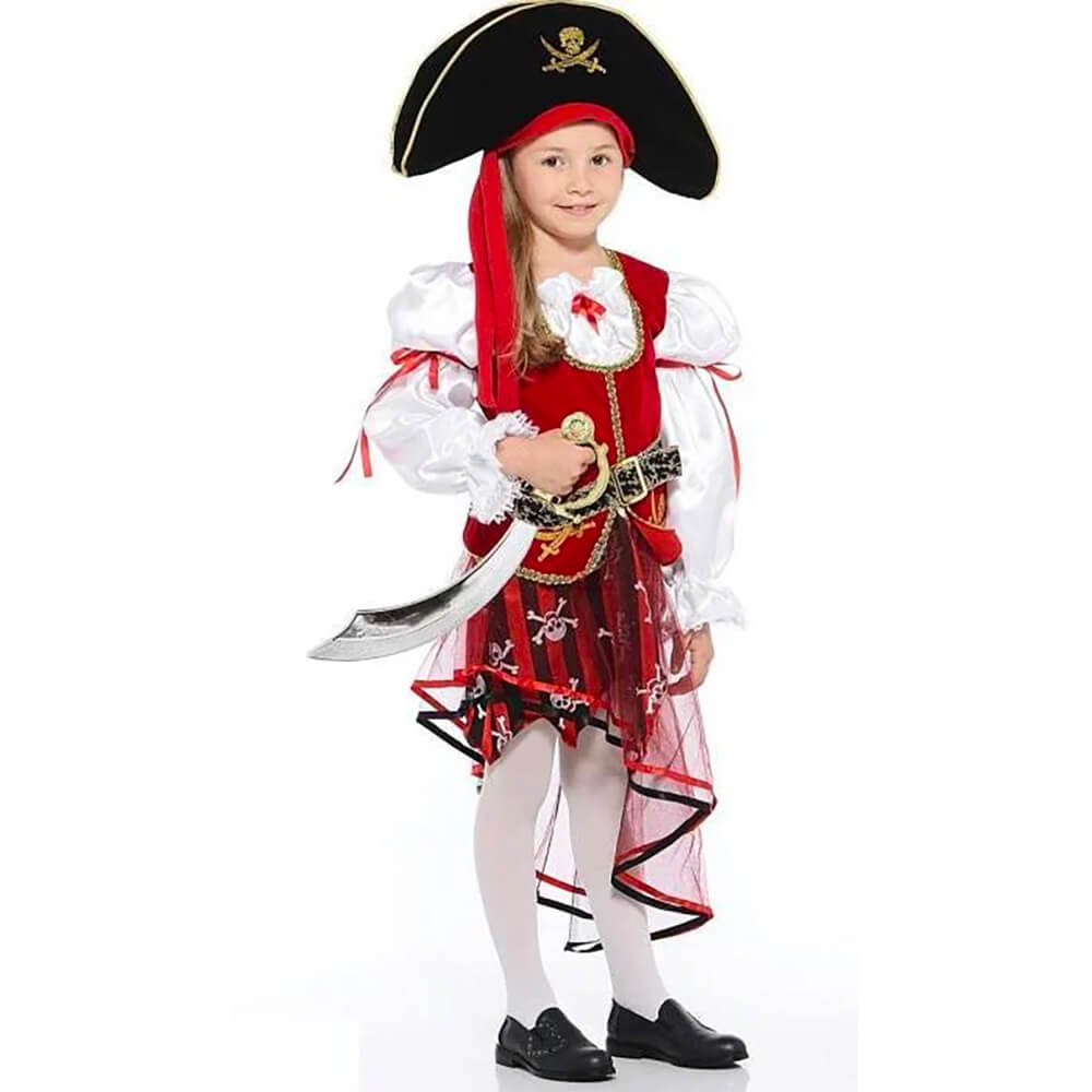 Детский маскарадный костюм «Пиратка / разбойница» - это красивый задорный наряд героини любимой сказки. Наряд смелой разбойницы, предводительницы грозной шайки состоит из белой блузы с широкими рукавами, красного жилета с золотой отделкой, сложнокроенной многослойной юбки, шляпы с Веселым Роджером. Девочка легко вживется образ лихой разбойницы. Вы будете рады видеть свою малышку счастливой.