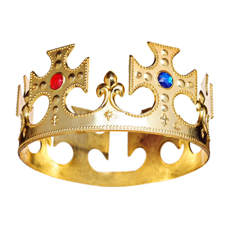 Корона короля золотая, регулируемая по размеру головы. Украшена разноцветными камнями.