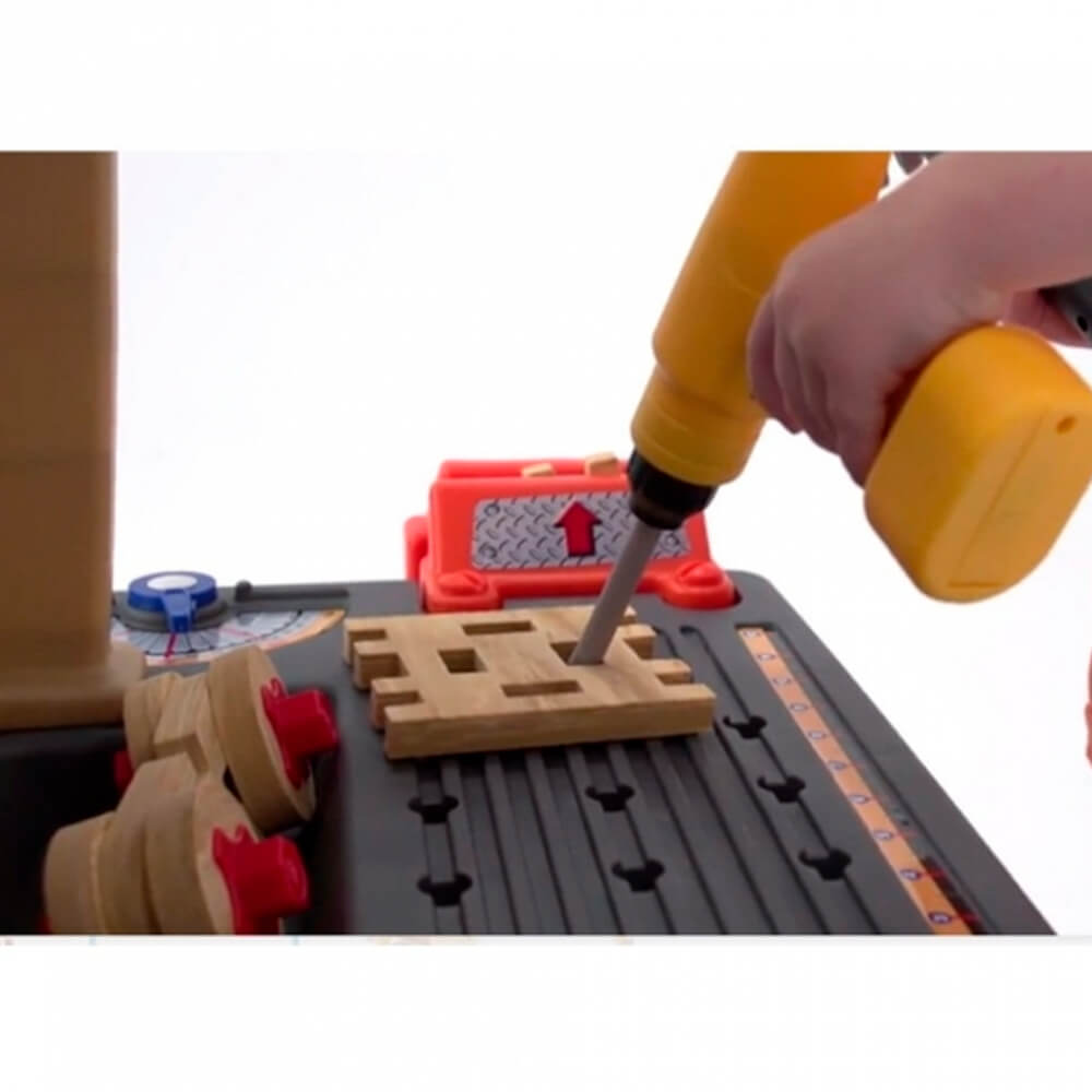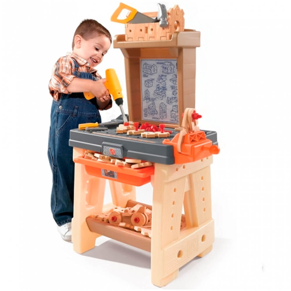 Игровой набор верстак "Умелые руки" с деталями для моделирования Workshop Step2. Прочный стол выполнен под фактуру дерева. Верхняя и нижняя полки для хранения инструментов. Рабочая поверхность оснащена выдвижным ящиком, отверстиями для крепления винтов и встроенными тисками.
