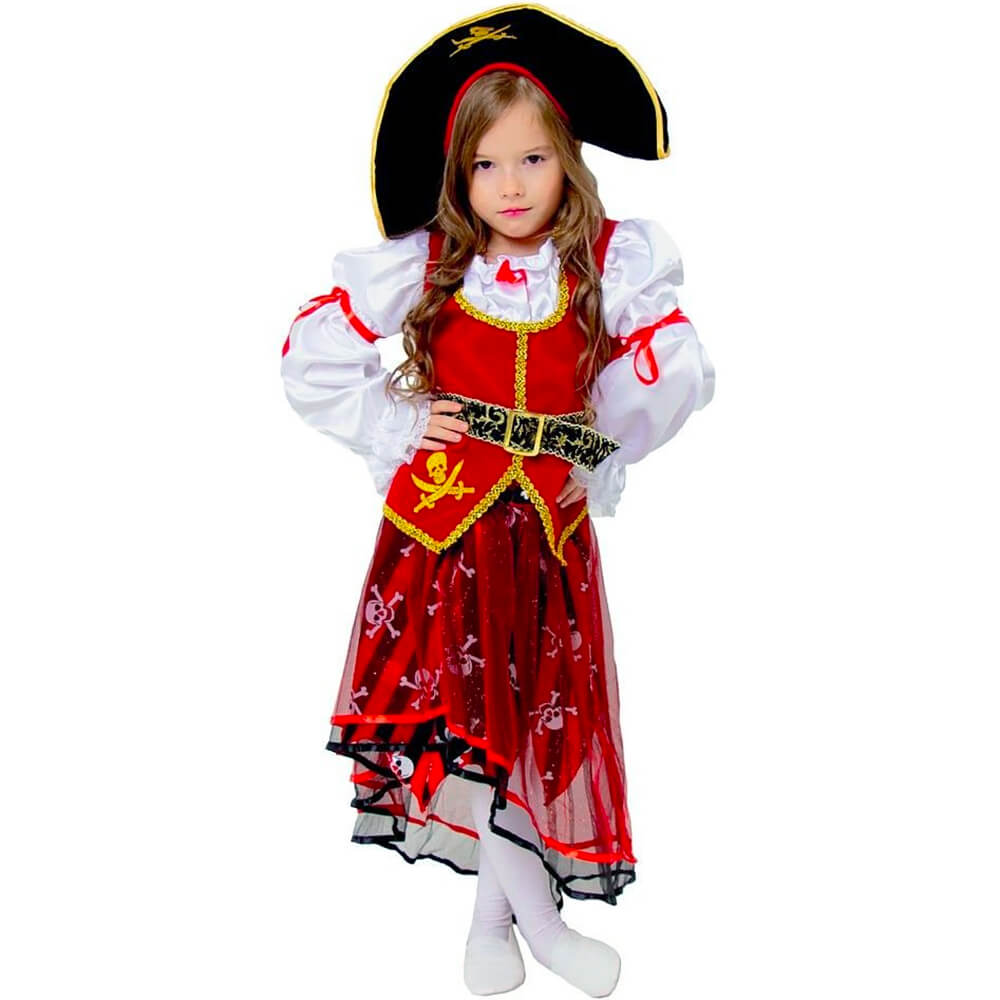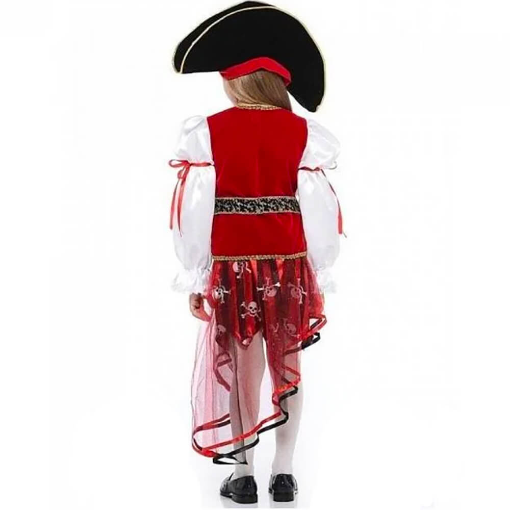 Детский маскарадный костюм «Пиратка / разбойница» - это красивый задорный наряд героини любимой сказки. Наряд смелой разбойницы, предводительницы грозной шайки состоит из белой блузы с широкими рукавами, красного жилета с золотой отделкой, сложнокроенной многослойной юбки, шляпы с Веселым Роджером. Девочка легко вживется образ лихой разбойницы. Вы будете рады видеть свою малышку счастливой.