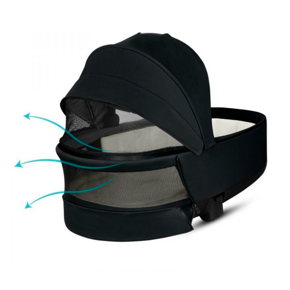 Основной «фишкой» спального блока Lux Carry Cot является уникальная система вентиляции. Она включает в себя скрытое отделение в капюшоне, спрятанное под текстильным клапаном, и большое сетчатое окно, интегрированное в изголовье люльки
