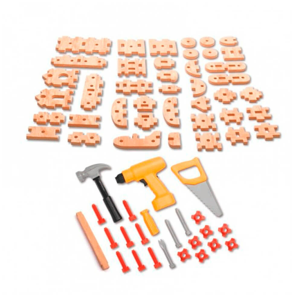 Игровой набор верстак "Умелые руки" с деталями для моделирования Workshop Step2. Прочный стол выполнен под фактуру дерева. Верхняя и нижняя полки для хранения инструментов. Рабочая поверхность оснащена выдвижным ящиком, отверстиями для крепления винтов и встроенными тисками.