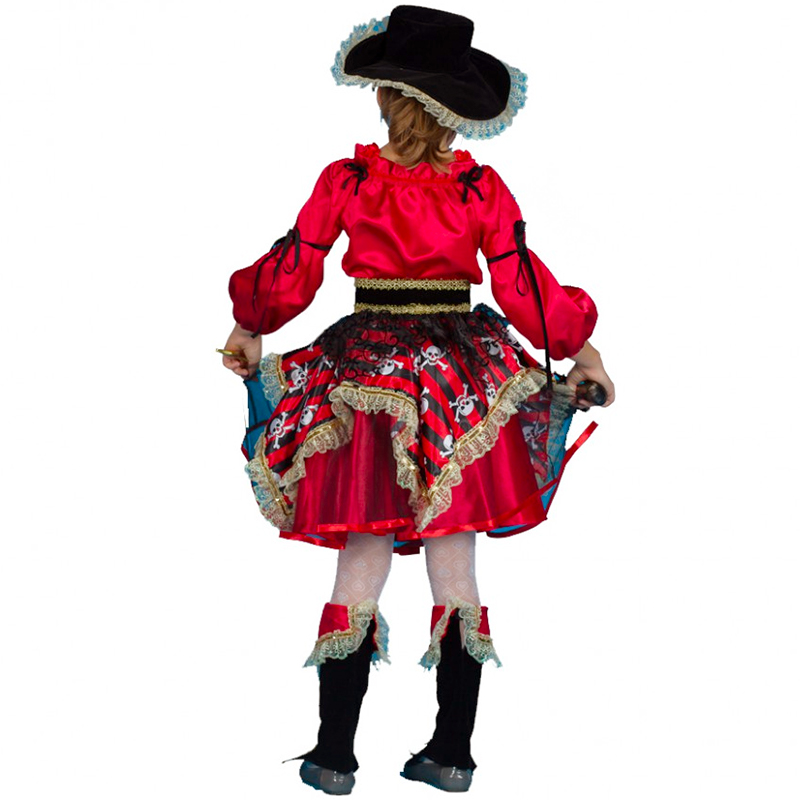 Детский маскарадный костюм «Пиратка красная» - это красивый элегантный наряд для маленькой неугомонной проказницы. Он создан для Вашей девочки, с учетом подвижности и особенностей детской фигуры. Он подойдет к любому празднику, запомнится всем гостям и приведет в восторг Вашу малышку. Наряд романтичной пиратки, бесстрашной, находчивой завоевательницы сокровищ далеких островов состоит из блузы с широкими рукавами, пышной красочной юбки сложного кроя, затейливых высоких сапог и невероятной пиратской шляпы. Девочка легко вживется образ красавицы пиратки. Вы будете рады видеть свою дочь счастливой.