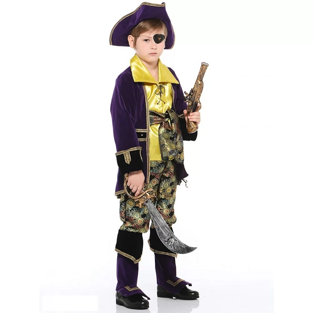 Детский маскарадный костюм «Капитан пиратов» - это красивый элегантный наряд романтического героя. Он создан для Вашего юного мужчины, с учетом подвижности и особенностей детской фигуры. Он подойдет к любому празднику, запомнится всем гостям и приведет в восторг Вашего сына. Наряд героя романов о капитане Бладе или Моргане, смелом, бесстрашном, находчивом завоевателе сокровищ далеких островов состоит из приталенного кафтана, расшитого золотом, с высокими манжетами, рубахи на шнуровке с широкополым воротничком, широких штанов, затейливых высоких сапог, лихо повязанного платка и повязки на глаза. Мальчик легко вживется образ красавца пирата. Вы будете рады видеть своего малыша счастливым.