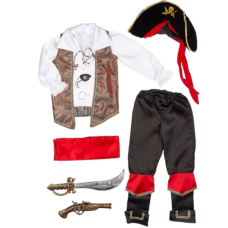 Детский маскарадный костюм «Флинт» - это красивый элегантный наряд романтического героя. Он создан для Вашего юного мужчины, с учетом подвижности и особенностей детской фигуры. Он подойдет к любому празднику, запомнится всем гостям и приведет в восторг Вашего малыша. Наряд героя романа Роберта Стивенсона, смелого завоевателя сокровищ далекого острова состоит из белоснежной рубахи на шнуровке с широкополым воротничком и изящными манжетами, длиннополого жилета, перетянутого в поясе красным кушаком, широких штанов, затейливых высоких сапог, пиратской шляпы с Веселым Роджером и повязки на глаза. Мальчик легко вживется образ красавца пирата. Вы будете рады видеть своего малыша счастливым.