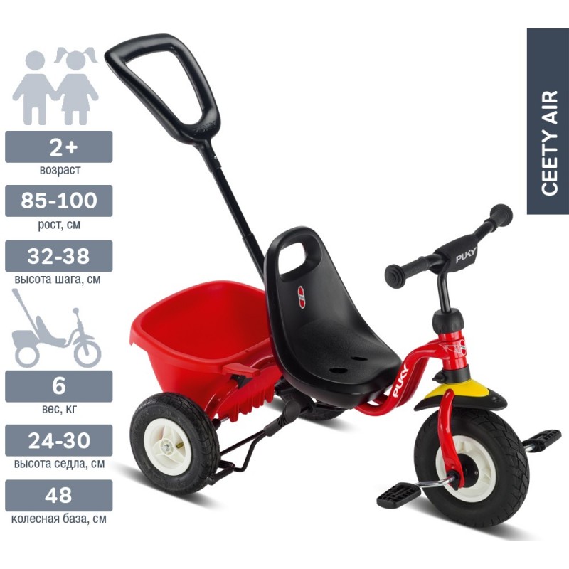 Трехколесный велосипед Puky Ceety Air имеет надувные колеса для мягкого хода на любом покрытии. Можно установить свободный ход вращения рулевого колеса, заблокировать руль или ограничить угол поворота руля.