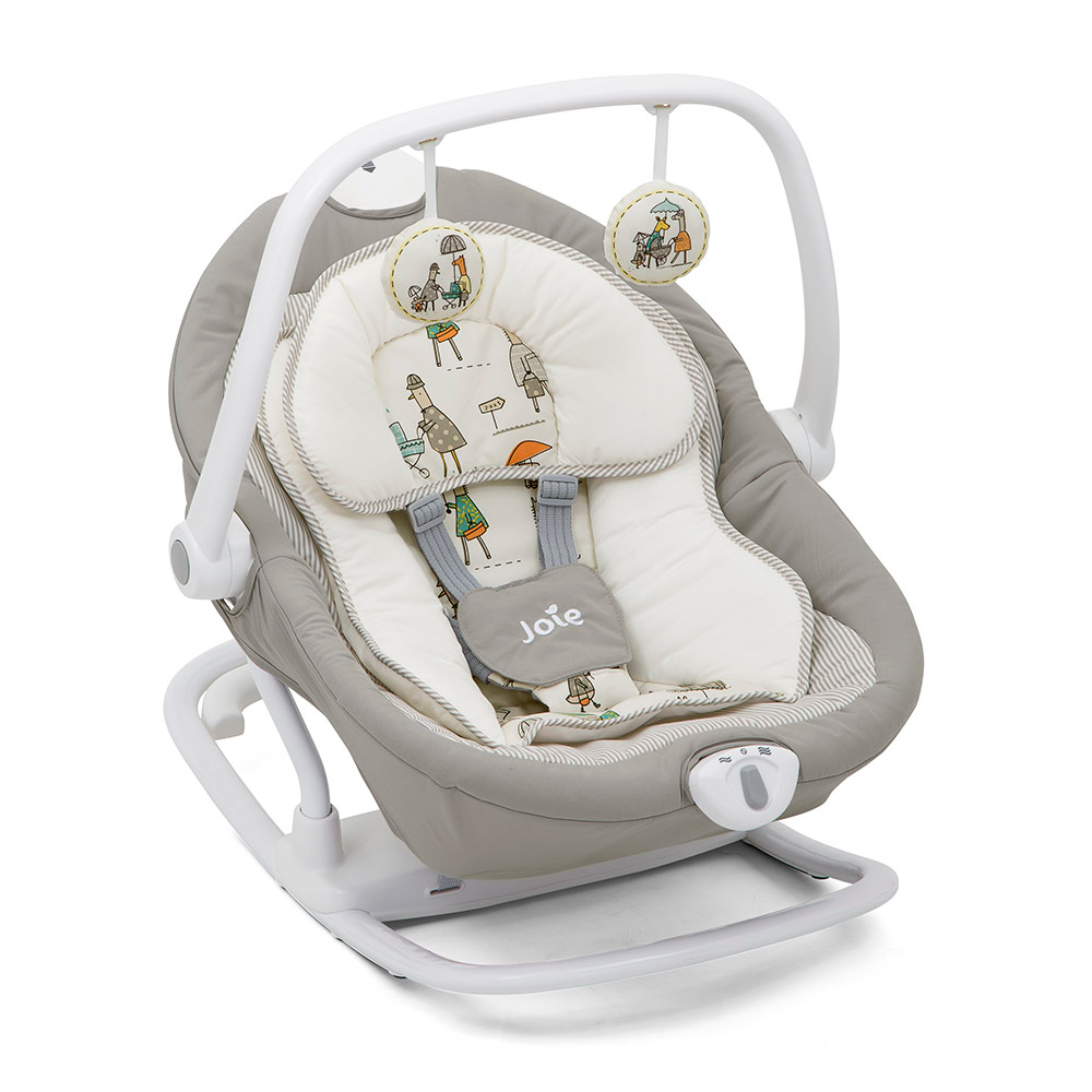 Шезлонг детский Joie Sansa от 0 до 13 кг. Имеет вибрацию на корпусе и ручку для переноски на которой закреплены две тканевые игрушки.
