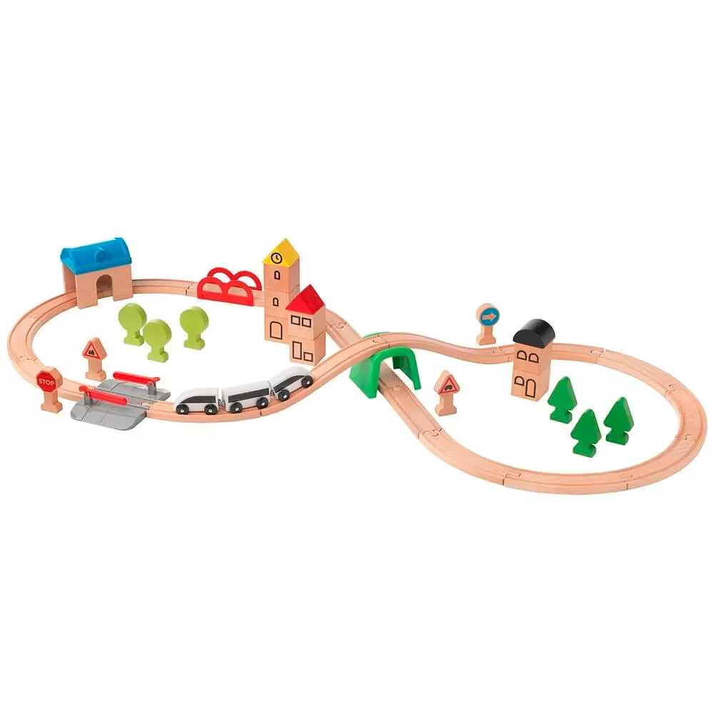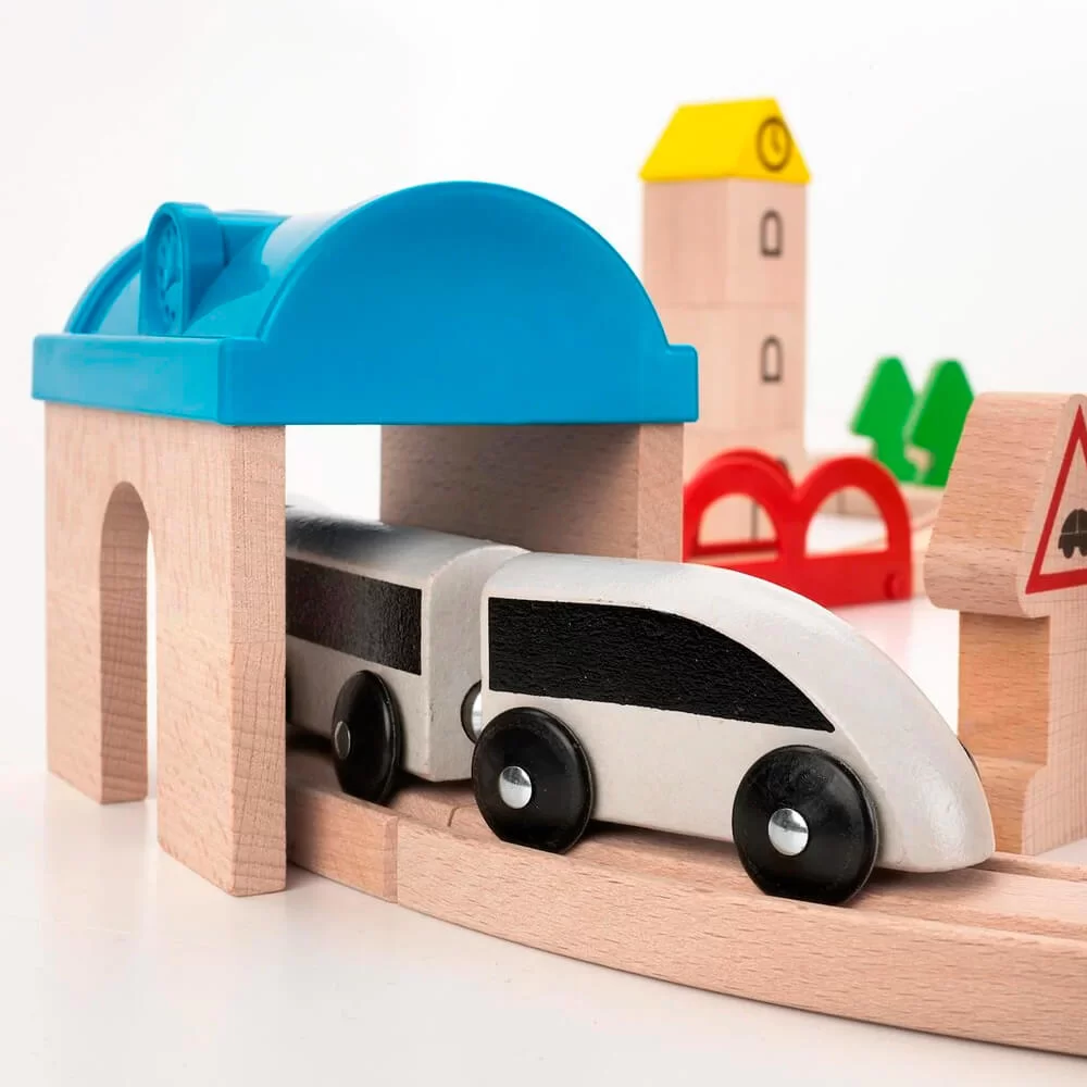 Железная дорога имеет поезд который проедет через туннели, мосты и переезды, промчится мимо зеленого леса и высотных зданий. Каждый предмет серии уникален с выразительным рисунком поверхности дерева и вариациями цвета. Развивает воображение, мелкую моторику и логическое мышление. Рекомендовано для детей от 2 лет.