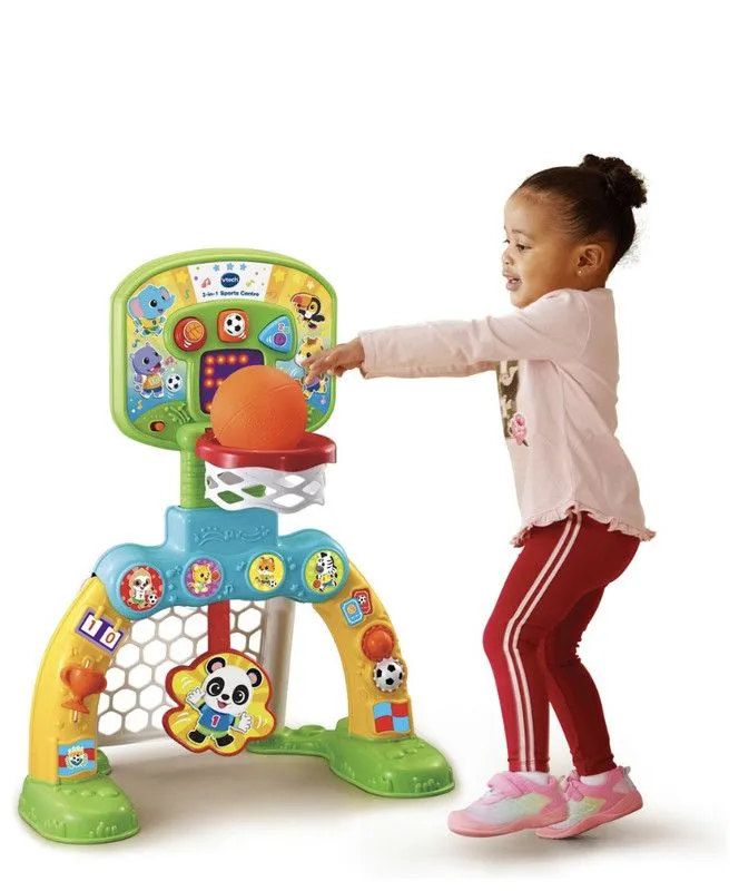 Спортивный центр - эта веселая и красочная детская игрушка, имеющая множество функций, которые развлекут и порадуют детей. Стреляйте в корзину, забивайте гол или попадайте в цель! Исследуйте больше функций, включая поворотные механизмы и выдвижной трофей.
