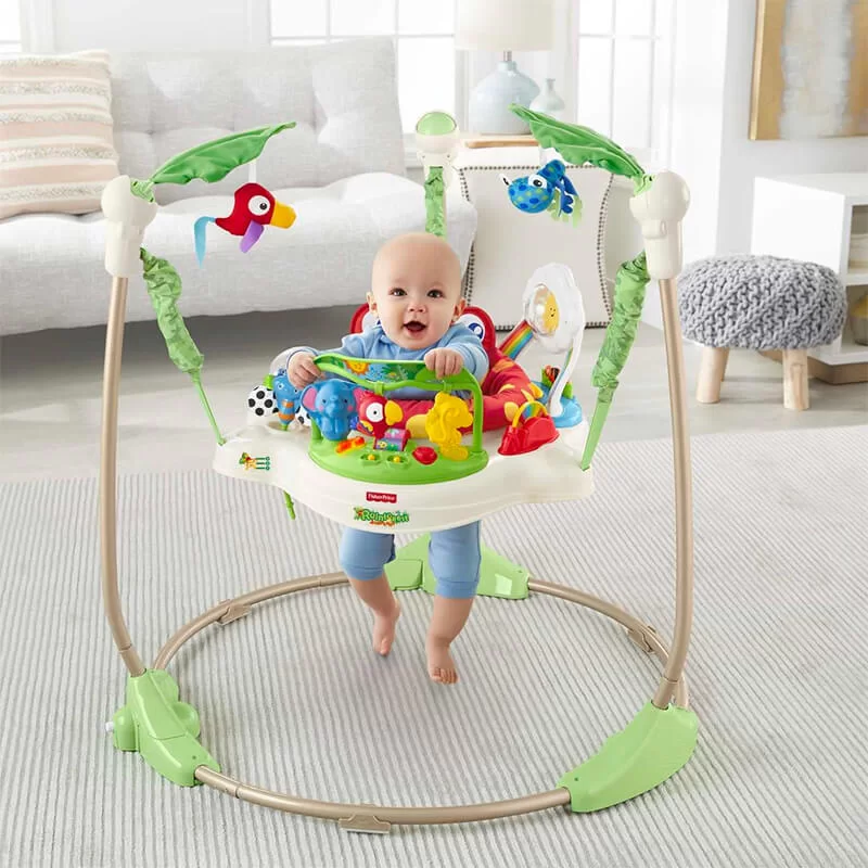 Можно весело играть и прыгать (прыжки активируют огни и звуки тропического леса) со всеми игрушками вокруг – и над головой – при этом сиденье вращается, что позволяет малышу исследовать все игрушки.
