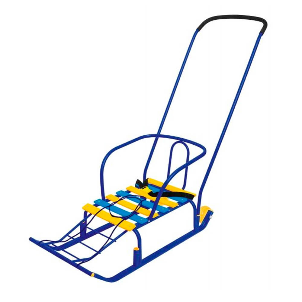 Санки комплектуются колесиками и съемным толкателем. Максимальная нагрузка — 25 кг.